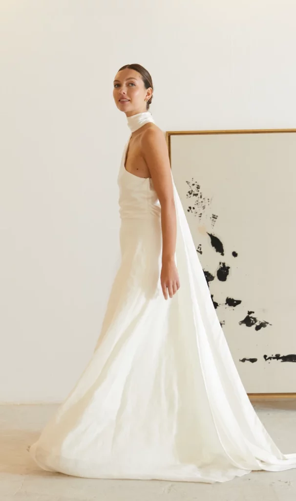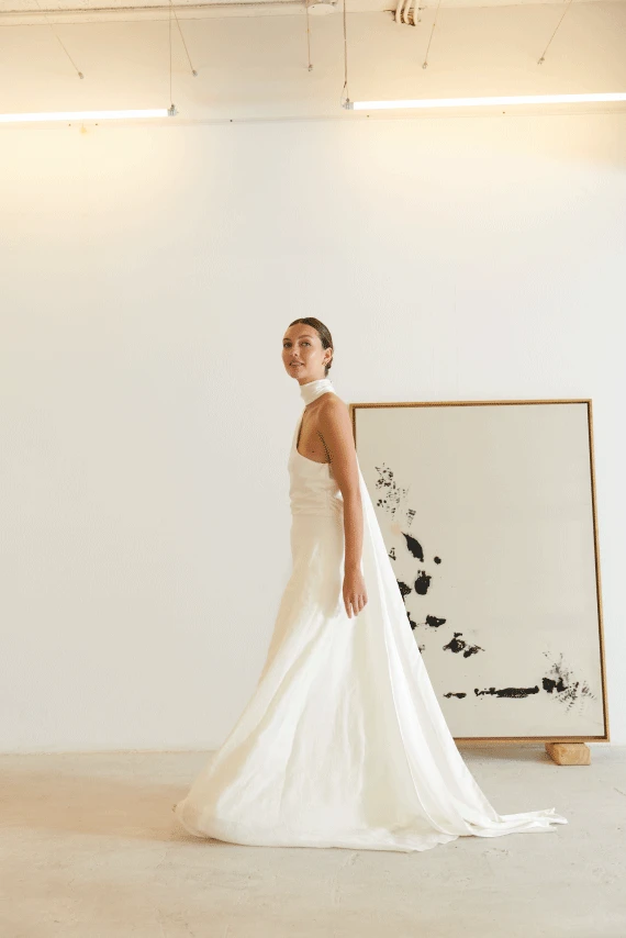 Desde el cuello nace un choker, con paneles desmontables que generan un efecto de arrastre. La falda es en línea evasse de organza de lino.