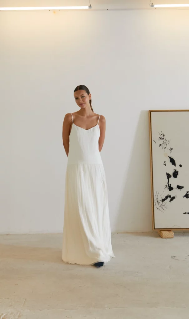 El vestido Lee está confeccionado en organza de lino 100% en el superior, y la falda en gasa de seda natural 100%.